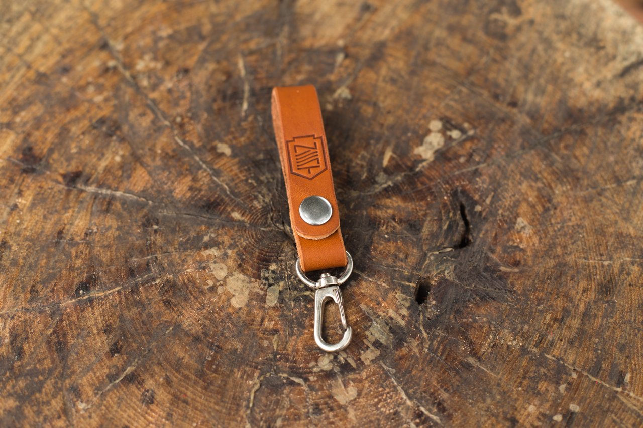 The belt loop keychain uses 5oz saddle skirting leather from the USA. The tops are smooth & polished with an English tan finish. All belt loops use solid brass or nickel button snaps and swivel hooks manufactured in the USA.